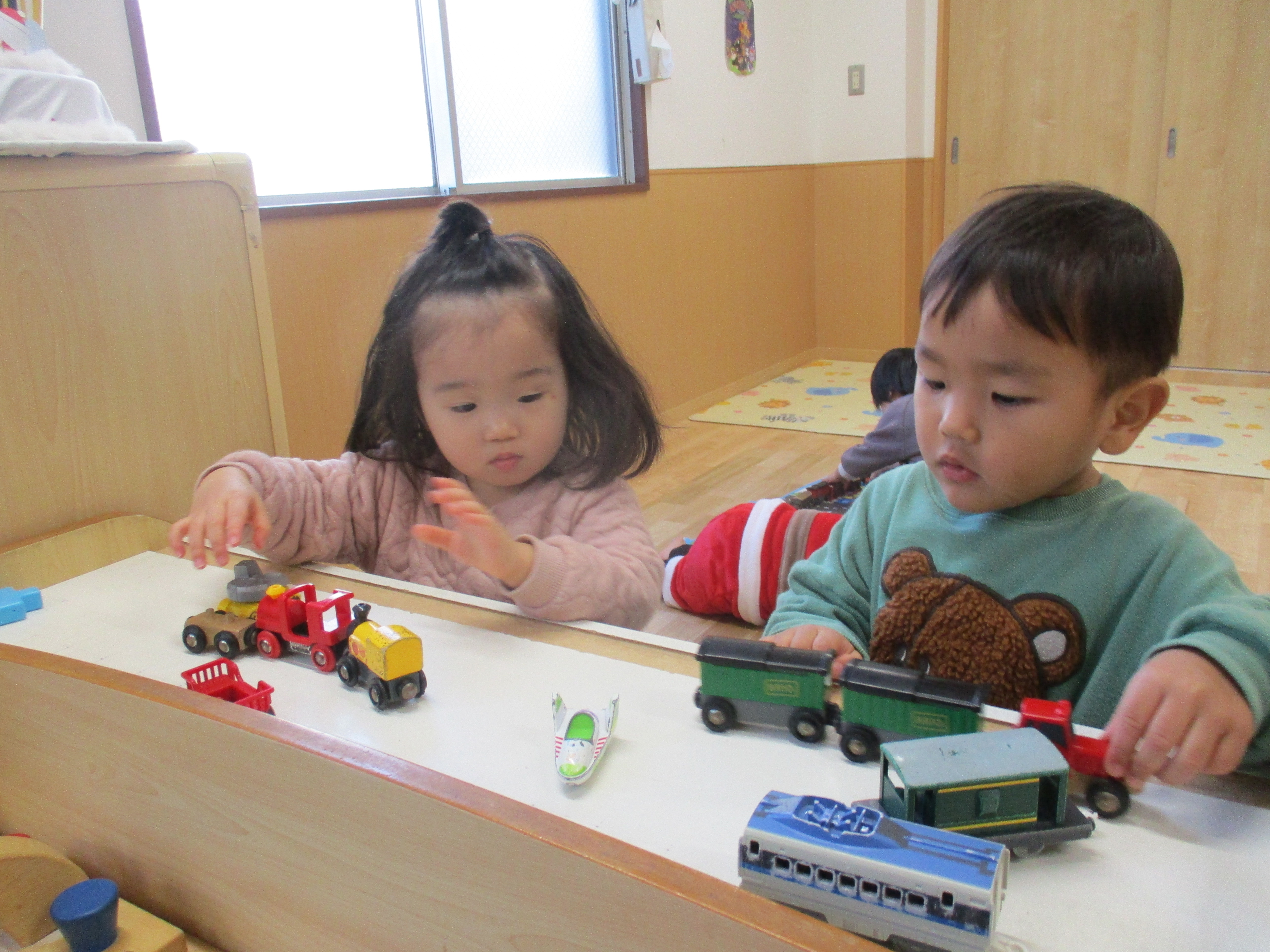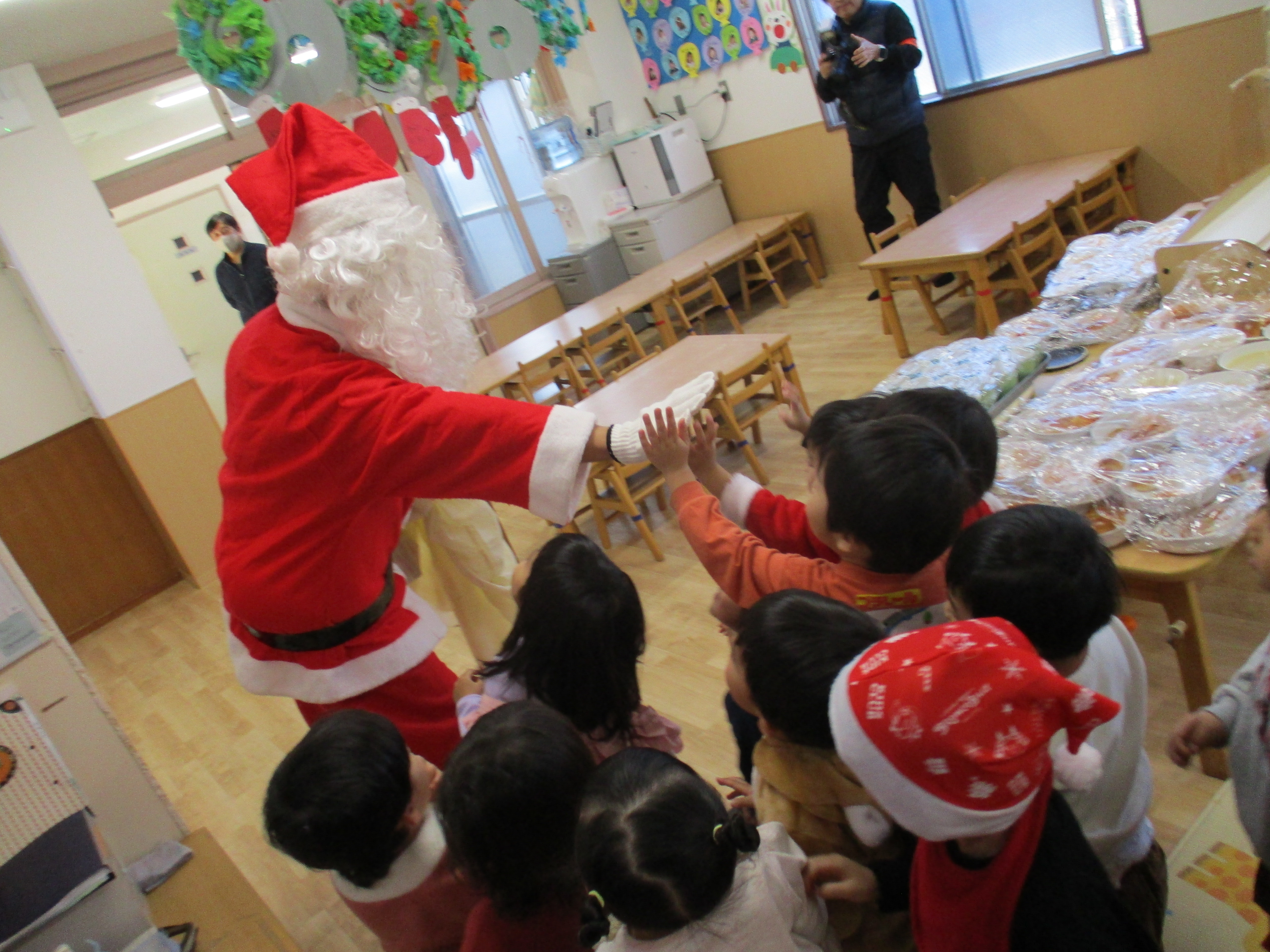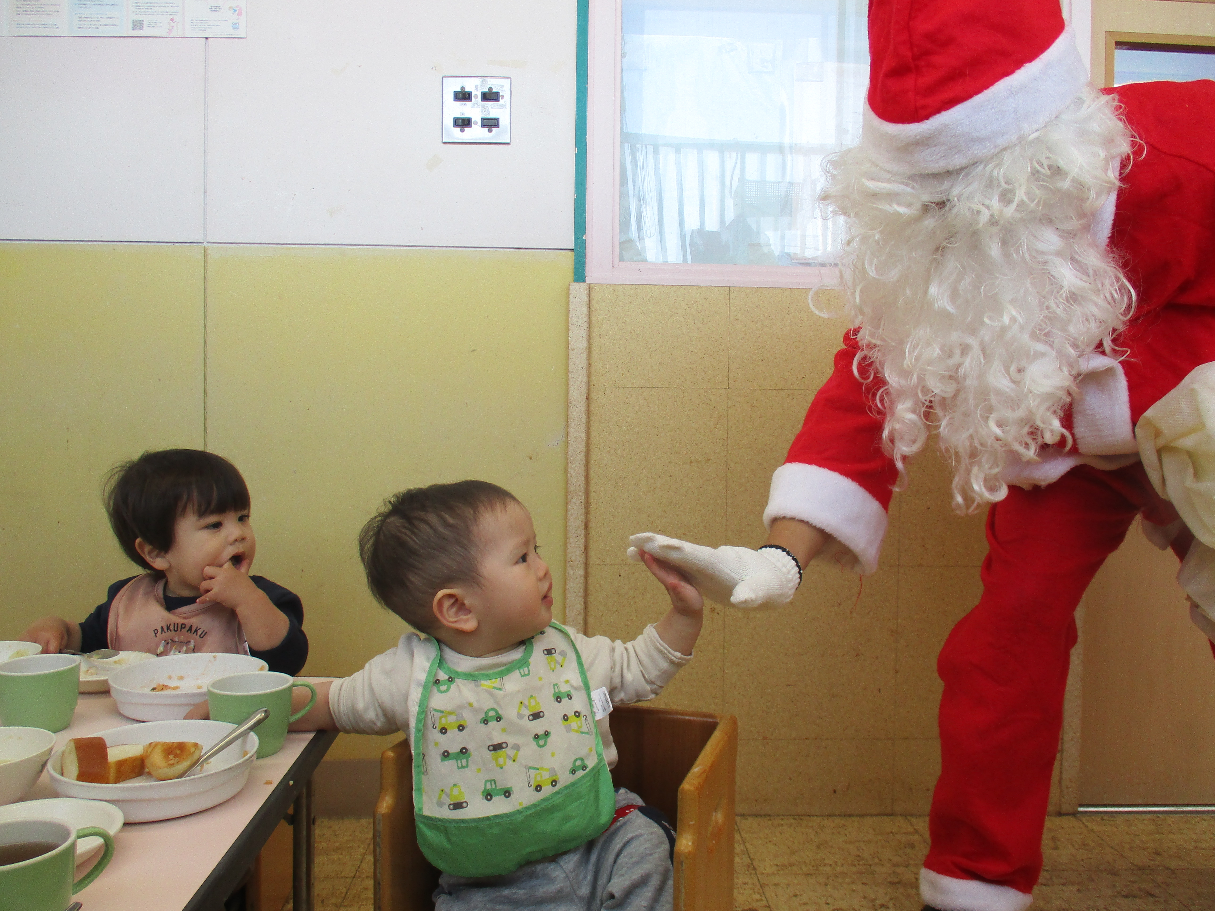 子ども達がクリスマスにちなんだ洋服を着て、友達と見せ合うなど普段とは異なった雰囲気を楽しむ様子が見られました。日中は、1歳児組と2歳児組の保育室を開放し、自由に行き来して遊びました。おままごとでは、まな板や包丁、食べ物の玩具を使って調理する真似をしたり、お互いに完成した料理を食卓に並べて一緒に食べる姿が見られました。また、昼食前にサンタクロースが登場すると「バイバイ」と手を振ったり、タッチをして嬉しそうにしていました。サンタクロースが帰った後も「サンタさん来たね」と楽しそうに話す姿が見られました。