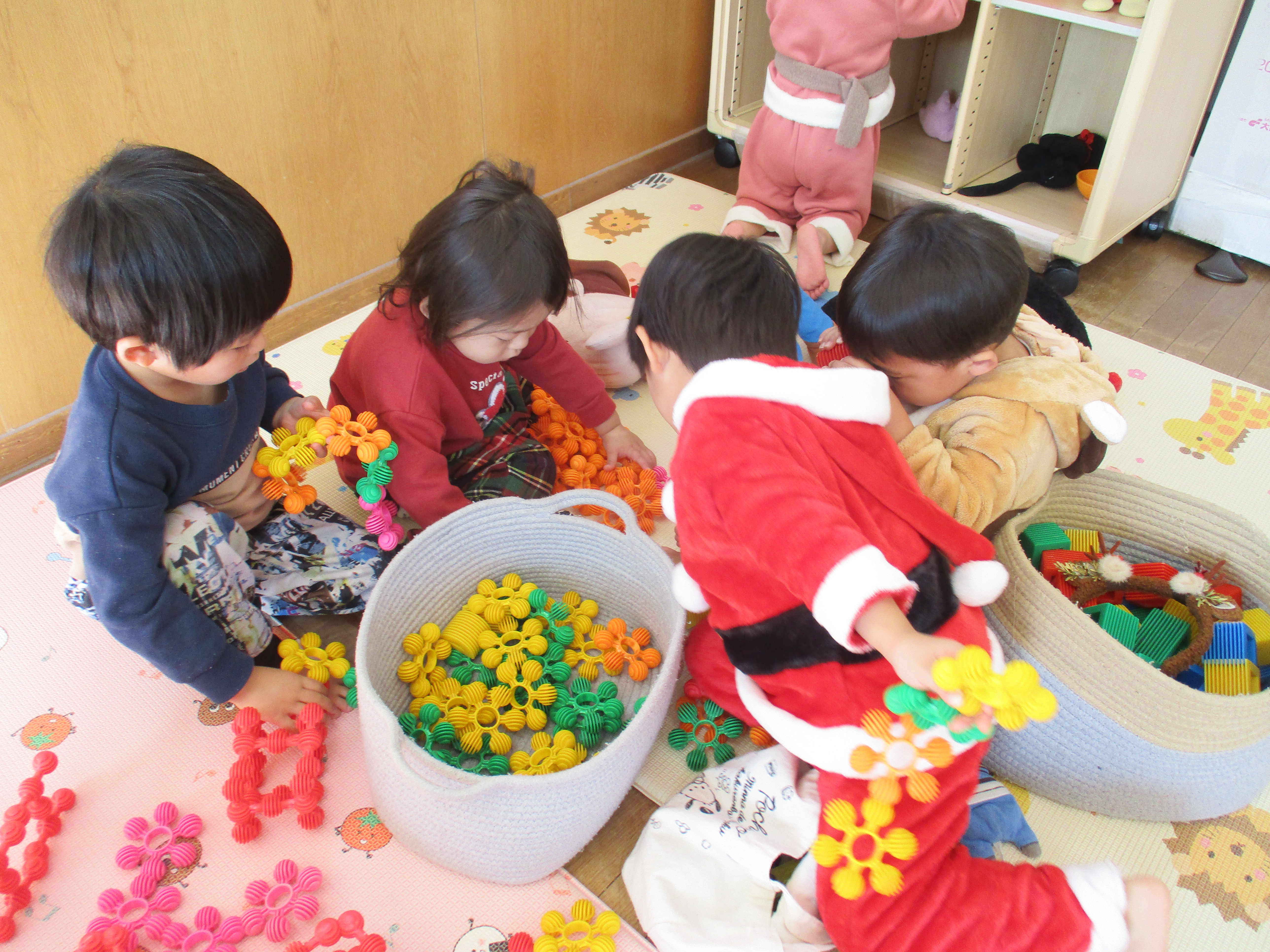 「12月の集い」当日は、子ども達がそれぞれクリスマスにちなんだ洋服を着たり、保育園で用意した髪飾り(耳の付いたカチューシャやサンタの帽子)などを身に付け、楽しい雰囲気の中で過ごしました。日中は、1歳児組と2歳児組の保育室を開放し、自由に行き来して遊びました。また、保育士がギターを演奏し、クリスマスソングを歌いました。音に合わせて手拍子をしたり、タイミングを合わせて「ヘイ」と掛け声を出し、2、3曲歌うことを楽しみました。昼食前は、サンタクロースが登場し、手を振ったりタッチをすることができ、喜んでいました。中には、サンタクロースに近付くことは怖いが、興味を持ち保育士の傍から様子を伺う子どもいました。