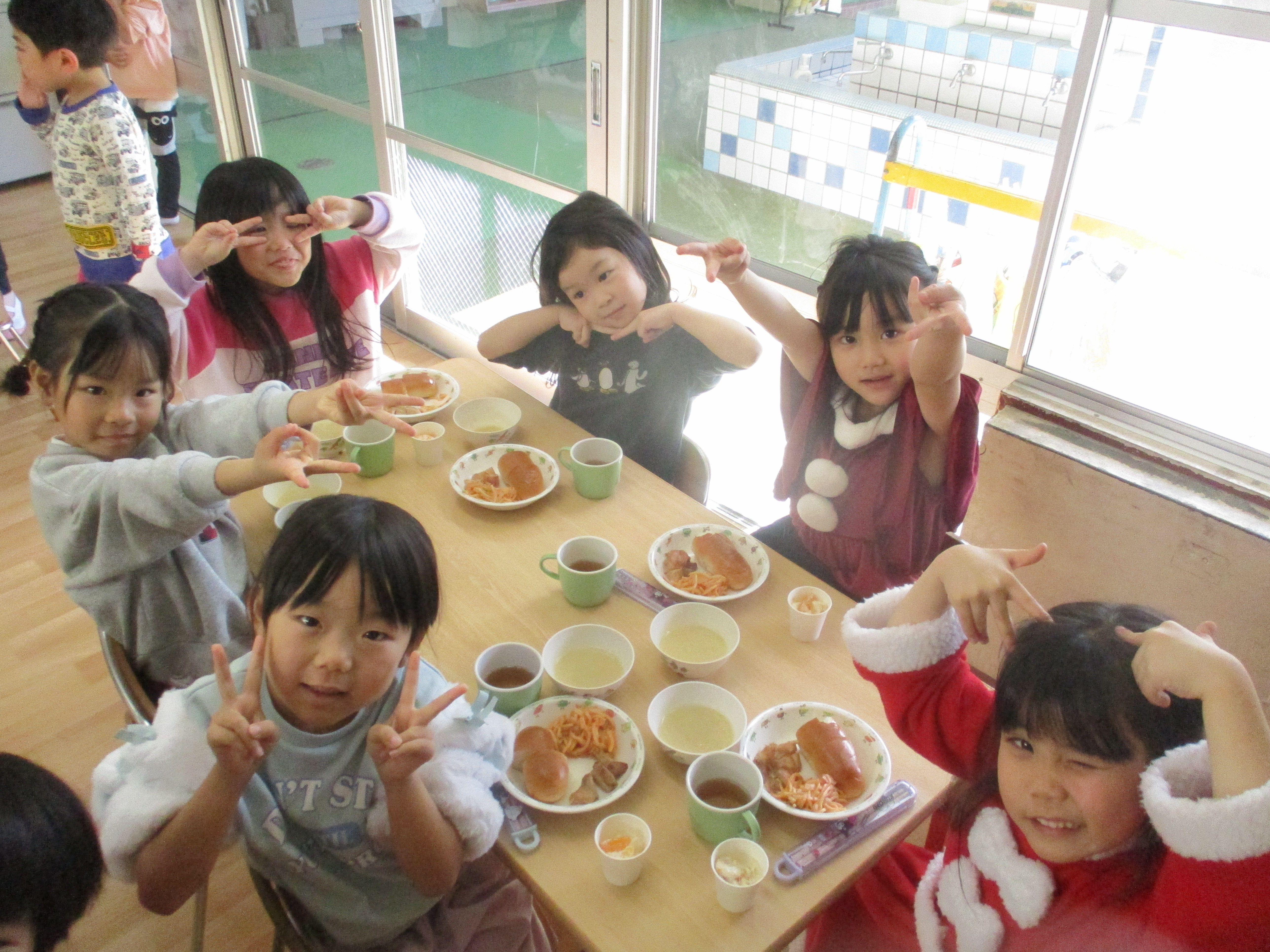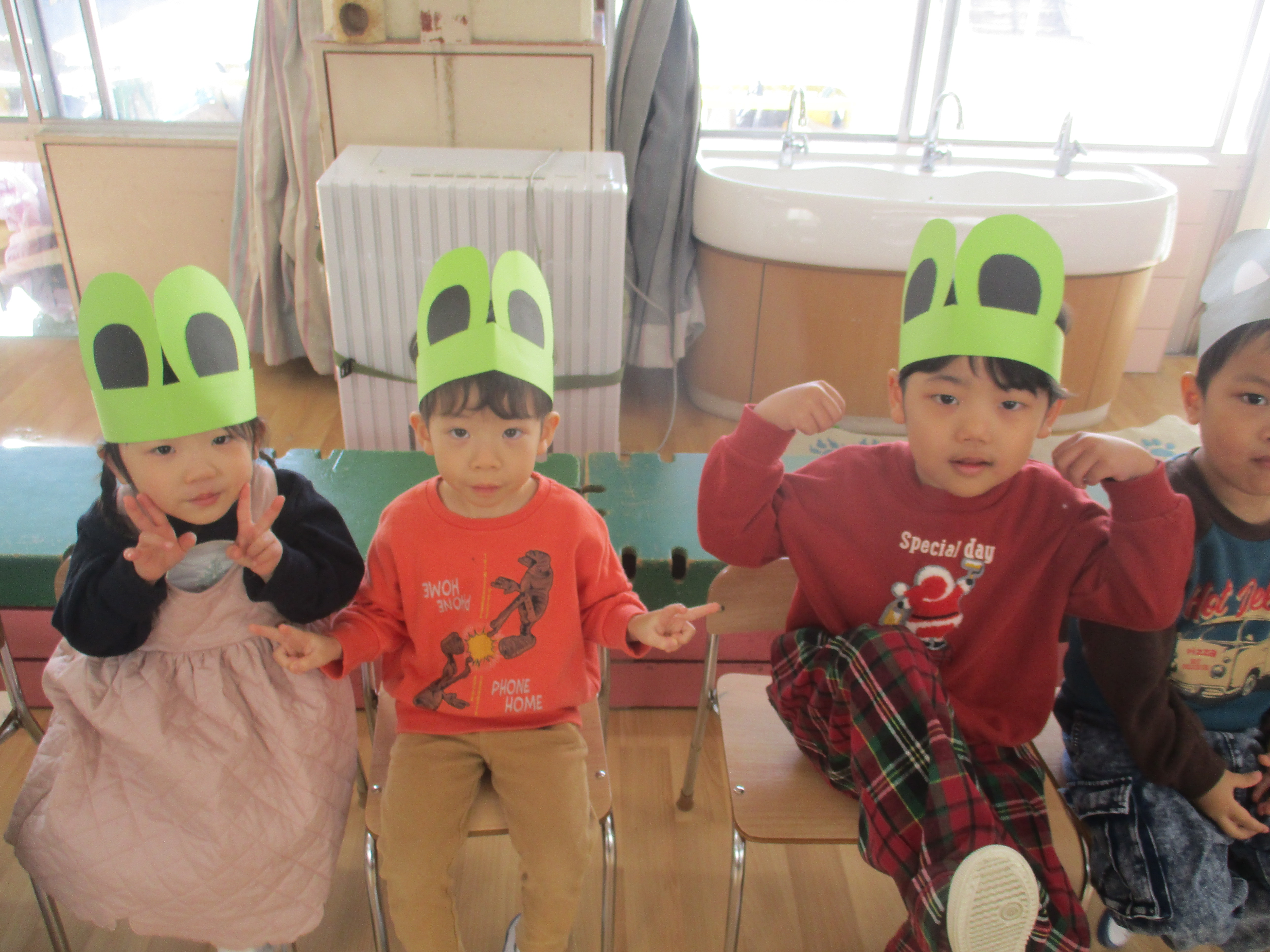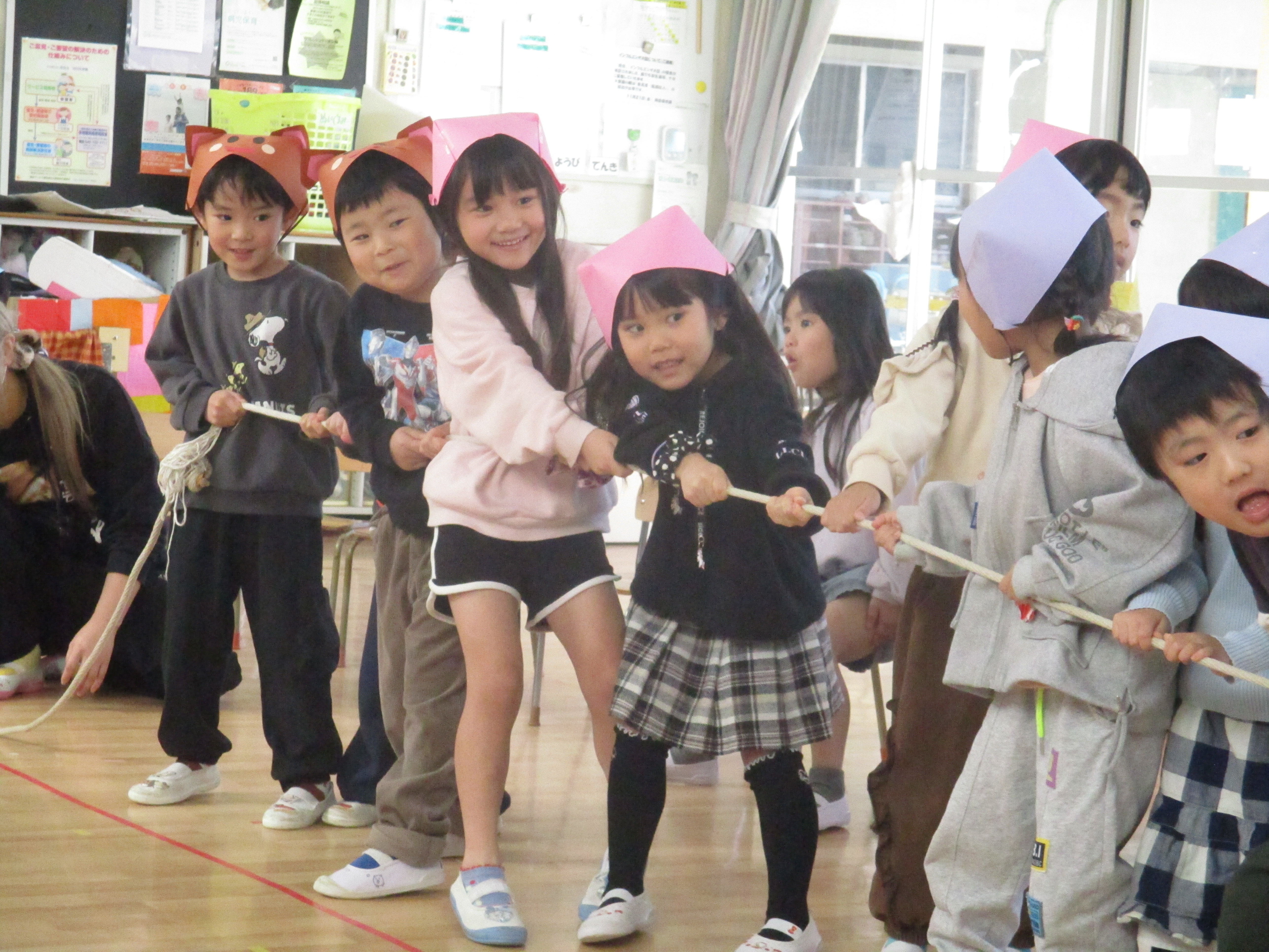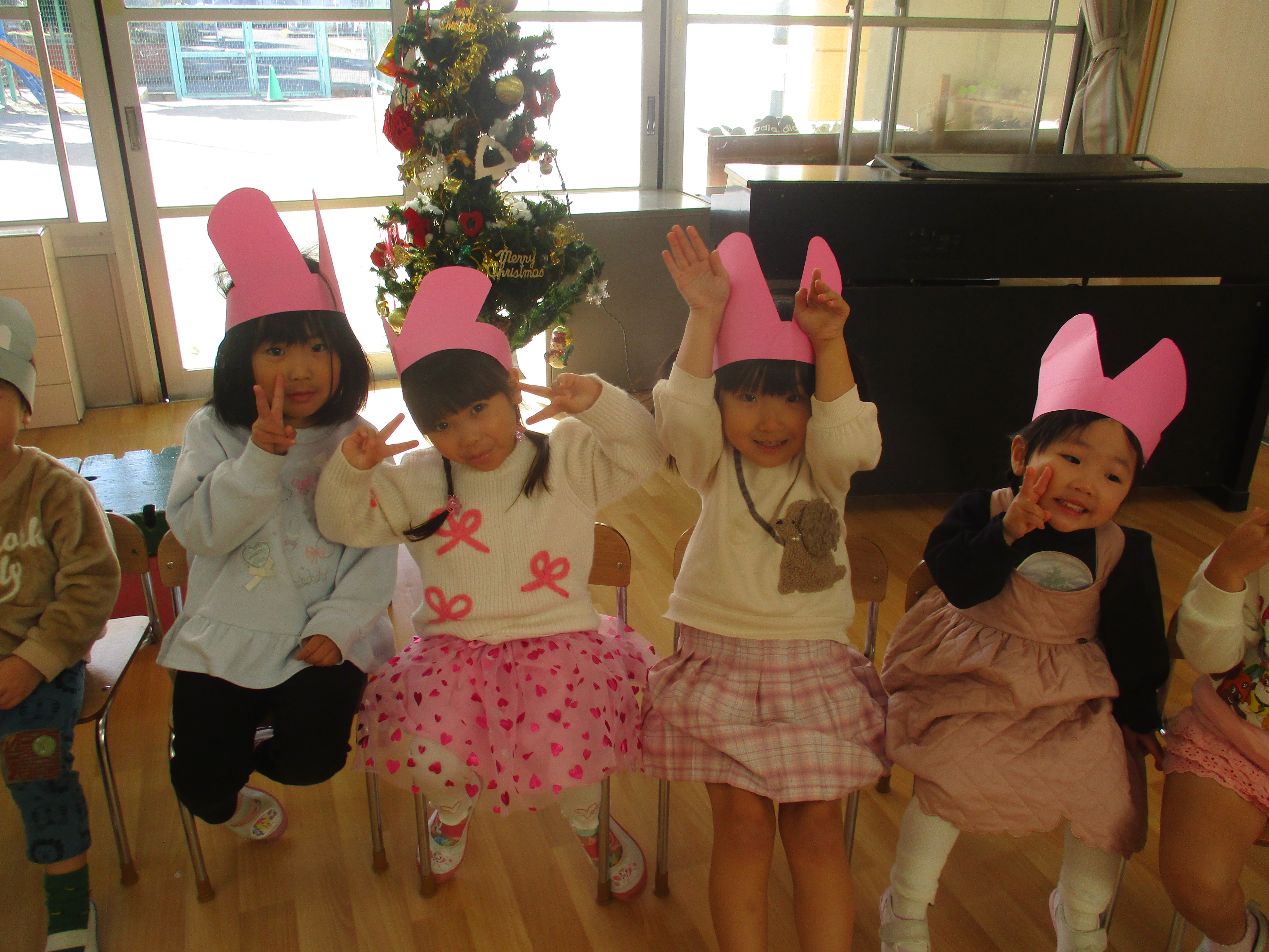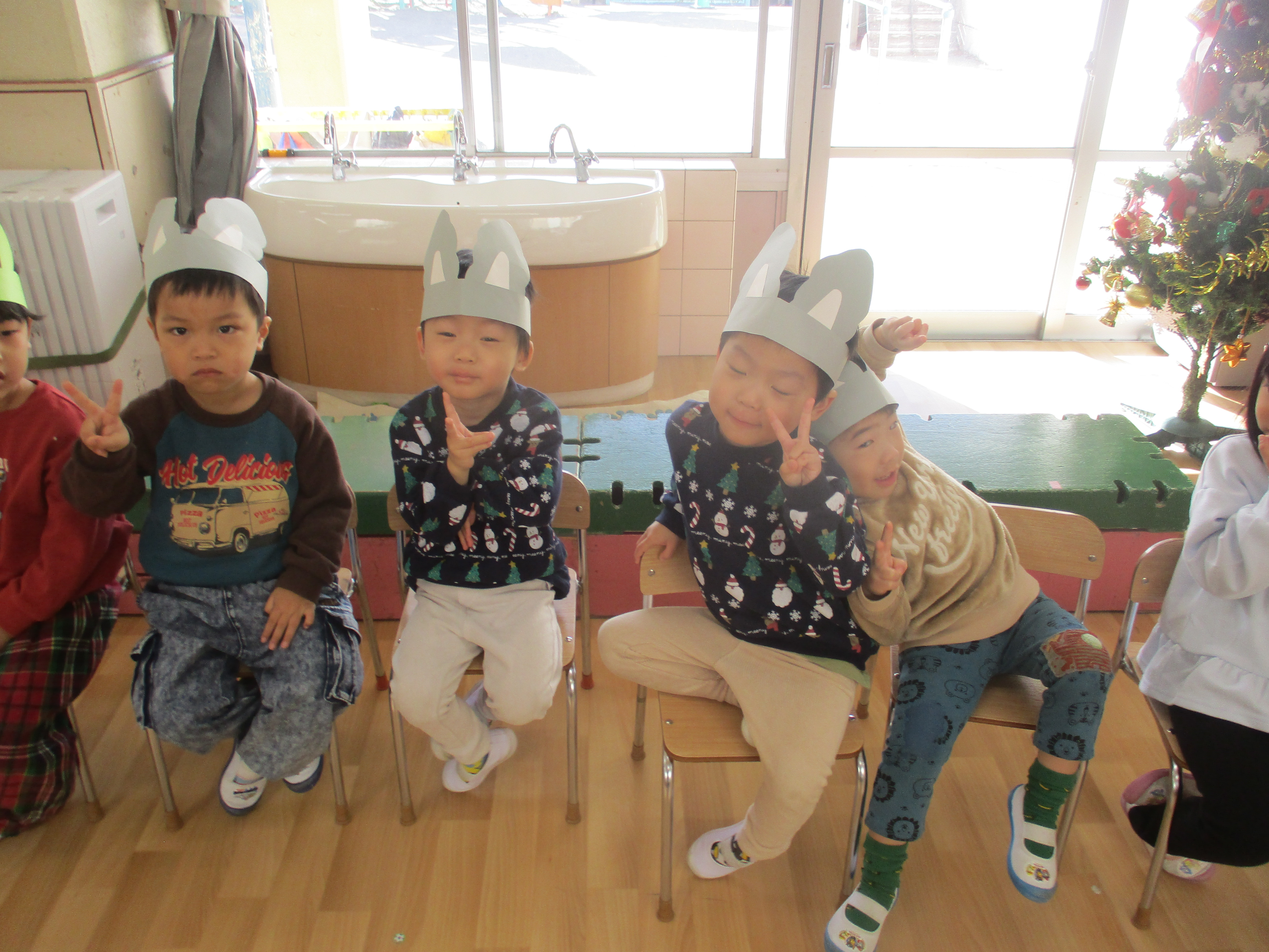 当日は、保護者の方に発表を見てもらうことをとても嬉しそうにしていました。子ども達が作った帽子を被ると「あと少しだね」と期待や緊張した表情を見せる子ども達でしたが、曲が流れると元気良く歌を歌う姿が見られ、一生懸命かぶを引っ張ったり、手遊びを行っていました。最後は、子ども達で手を繋ぎ「うんとこしょ、どっこいしょ」と力強く言い、一体感が生まれました。かぶが抜けると達成感に満ちた表情で終わりの挨拶ができました。その後「楽しかった」、「ぞう組になったらなにするの」と来年の12月の集いを楽しみにしている子どももいました。昼食では、普段とは異なったクリスマスの給食に「早く食べたい」と保育士や友達に嬉しそうに話しをしていました。
