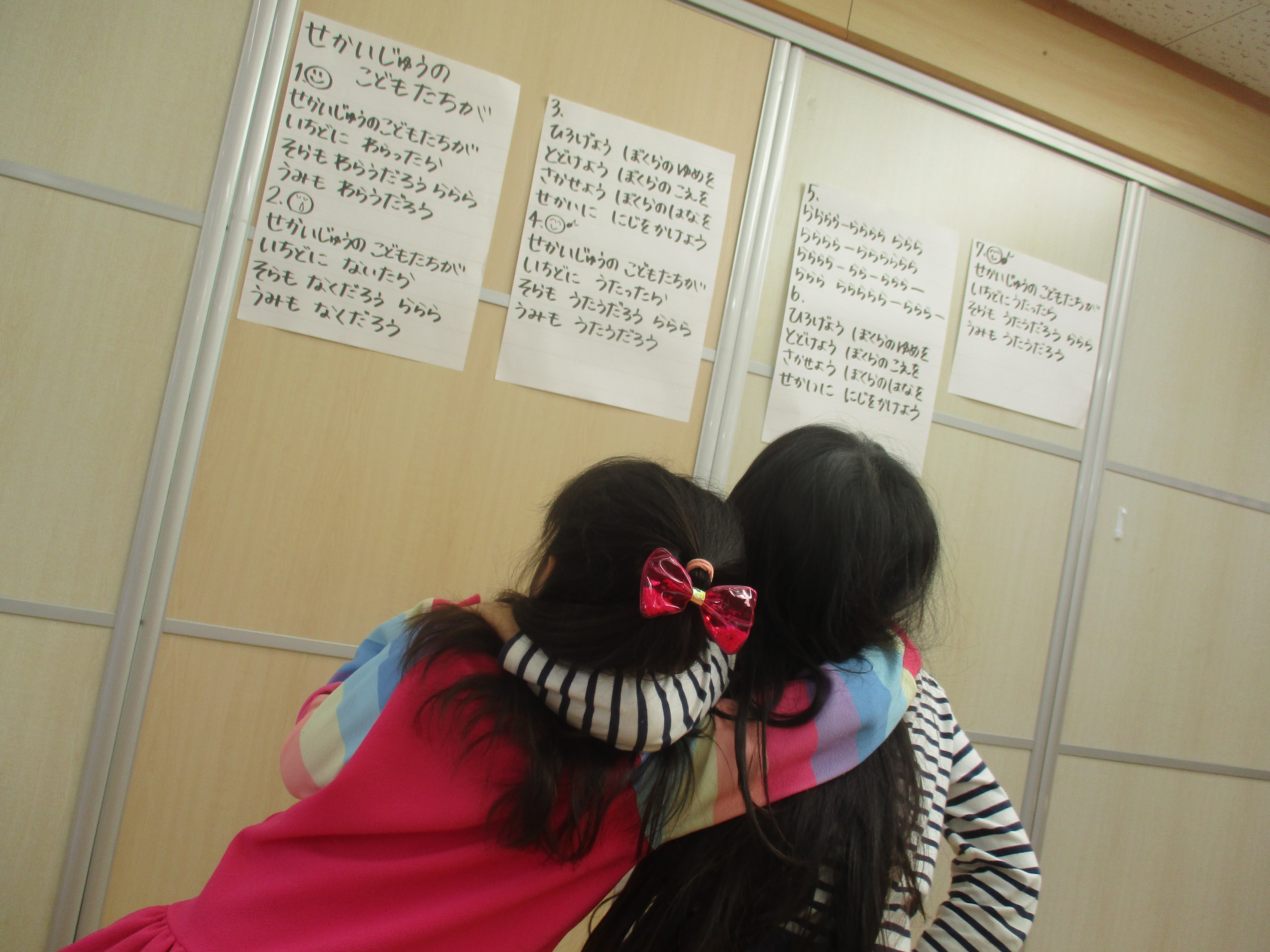 「12月の集い」の内容の話し合いを行う際に、「楽器がやりたい」と言う子どもが多く、合奏と歌を行うことに決めました。「鈴」、「マラカス」、「カスタネット」、「トライアングル」、「タンバリン」の5種類の楽器を使用し「赤鼻のトナカイ」の音楽に合わせて合奏を行いました。練習の際は、上手く音が揃わず「うるさく聞こえる」と話す子どももいましたが、練習を重ね、音が合うようになると合奏が楽しく感じ、意欲的に取り組むようになりました。また「歌も歌いたい」と言う子どももいたため「世界中の子どもたちが」を歌いました。歌詞カードを保育室に貼ると、歌詞を見ながら歌う姿も見られました。また、歌詞の一部の振り付けを子ども達が考えるなど、子どもが自発的に様々なことを考え、取り組む姿が見られました。子ども達が「年下の子ども達に見てもらいたい」と言い、ひよこ組、りす組、うさぎ組の子ども達に「招待状」を作成し、披露する機会を設けました。年下の子ども達や、他組の保育士に見守られながら披露する際、緊張も見られましたが「上手だったよ」と言われ、拍手をしてもらうと嬉しそうにしていました。